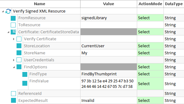Im folgenden Beispiel wird die Resource signedLibrary verifziert. Über den Parameter ExpectedResult wird das erwartete Resultat der Verifikation definiert.