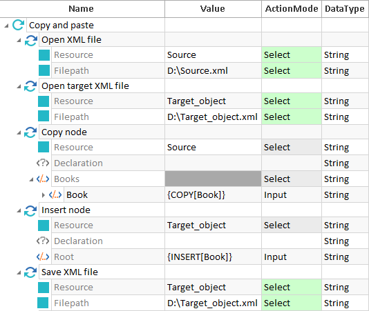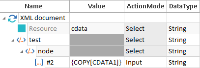 Um XML-Elemente zu kopieren, muss in die Spalte Wert der dynamische Ausdruck {COPY[resourceID]} eingetragen werden.