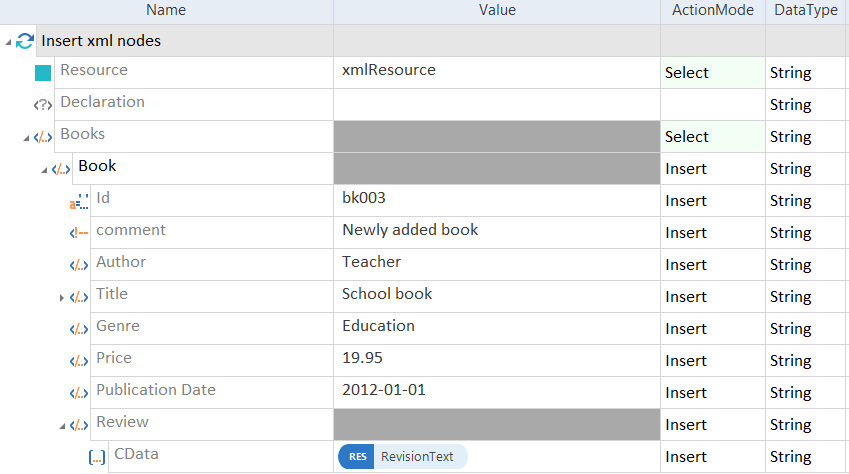 Der Inhalt der in die Resource xmlResource geladenen Datei books.xml wird editiert. Es wird ein neues Book-Element mit Unterelementen und Werten hinzugefügt. Die Aktion ist Insert. Für das Element Review wird ein CData Text aus der geladenen Resource RevisionText hinzugefügt.