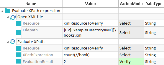 Der Inhalt der in die Ressource xmlResourceToVerify geladenen Datei books.xml wird verifiziert. Der unter XPath Expression angegebene Ausdruck wird ausgewertet. Das Ergebnis wird mit dem unter Evaluation Result angegebenen Wert verglichen. Es wird überprüft, ob in der Datei books.xml zwei Einträge book vorhanden sind.