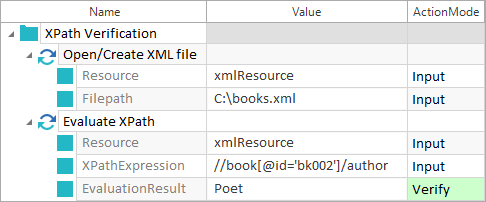 Der Inhalt der in die Ressource xmlResource geladenen Datei books.xml wird verifiziert. Der unter XPath Expression angegebene Ausdruck wird ausgewertet. Das Ergebnis wird mit dem unter Evaluation Result angegebenen Wert verglichen. Es wird überprüft, ob in der Datei books.xml für das book mit der id 'bk002' der Wert des Knotens author dem Wert Poet entspricht.