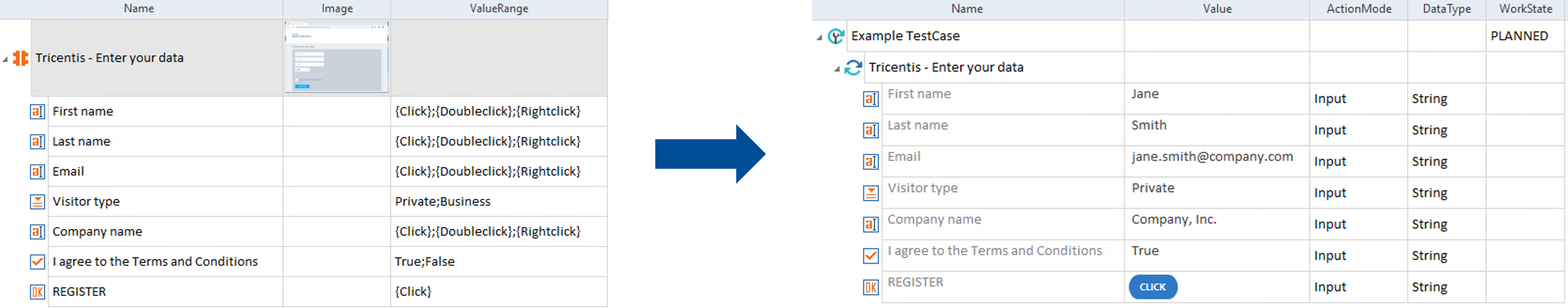 • Füllen Sie Ihre Testschritte aus. Zum Beispiel: Geben Sie den Text ein, den Tosca in ein Feld eingeben soll, wählen Sie einen Eintrag aus dem Aufklappmenü oder geben Sie einen gewöhnlichen Linksklick auf eine Schaltfläche an.