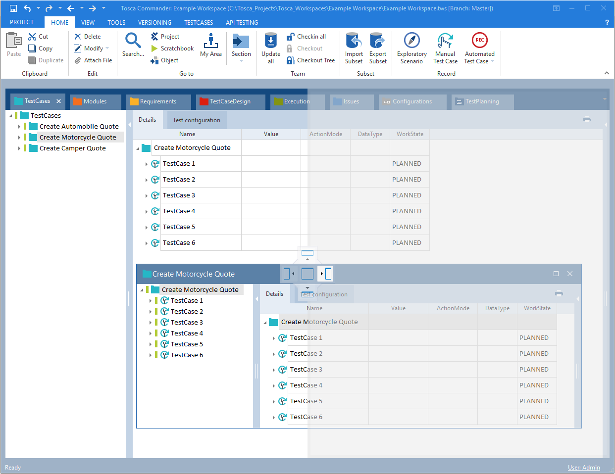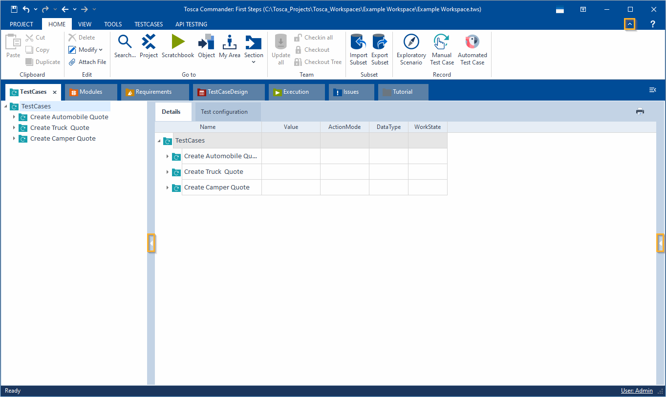 Tricentis Tosca bietet zwei Arten von Arbeitsbereichen: