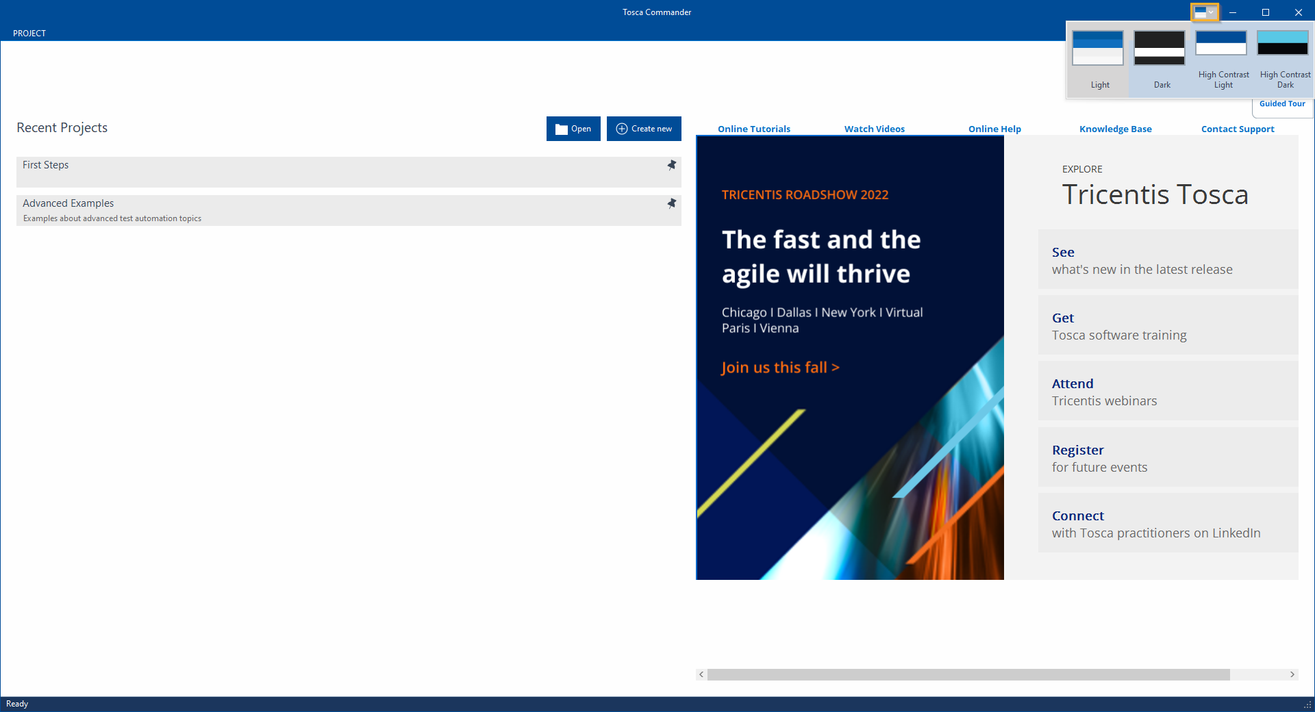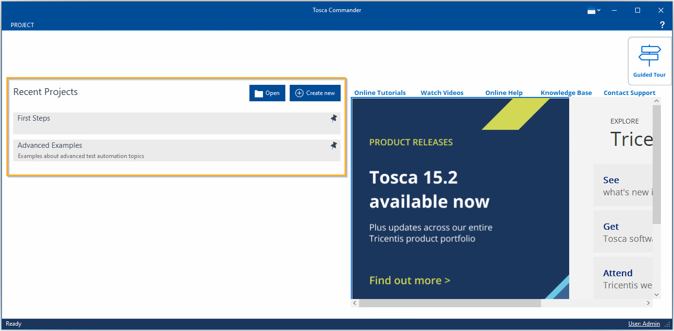 Arbeitsbereich über die Liste Recent Projects auf dem Startbildschirm des Tosca Commander öffnen