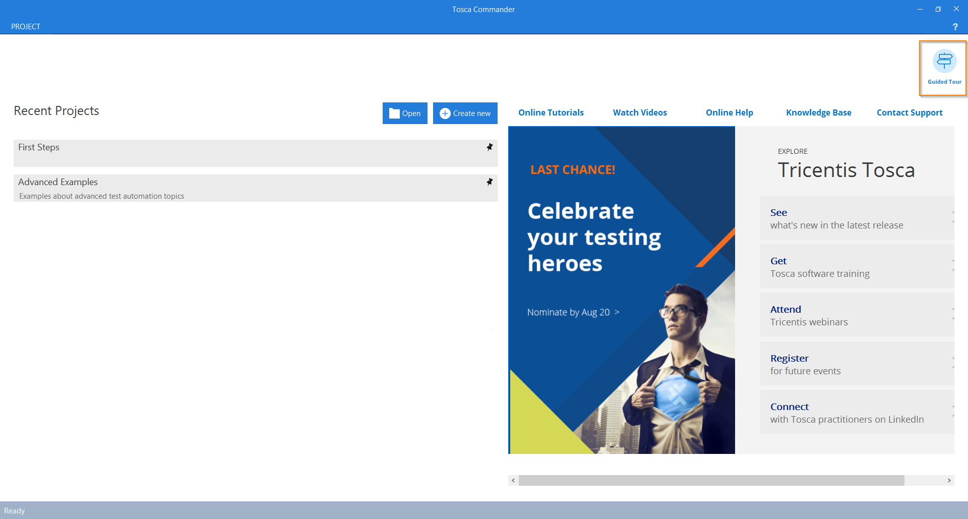 Unsere interaktive Führung führt Sie durch Ihre ersten Schritte mit dem Tosca Commander, der Benutzeroberfläche von Tricentis Tosca. Sie erstellen einen neuen Arbeitsbereich, zeichnen eine Applikation auf und entwerfen einen Testfall, den Sie ausführen können.
