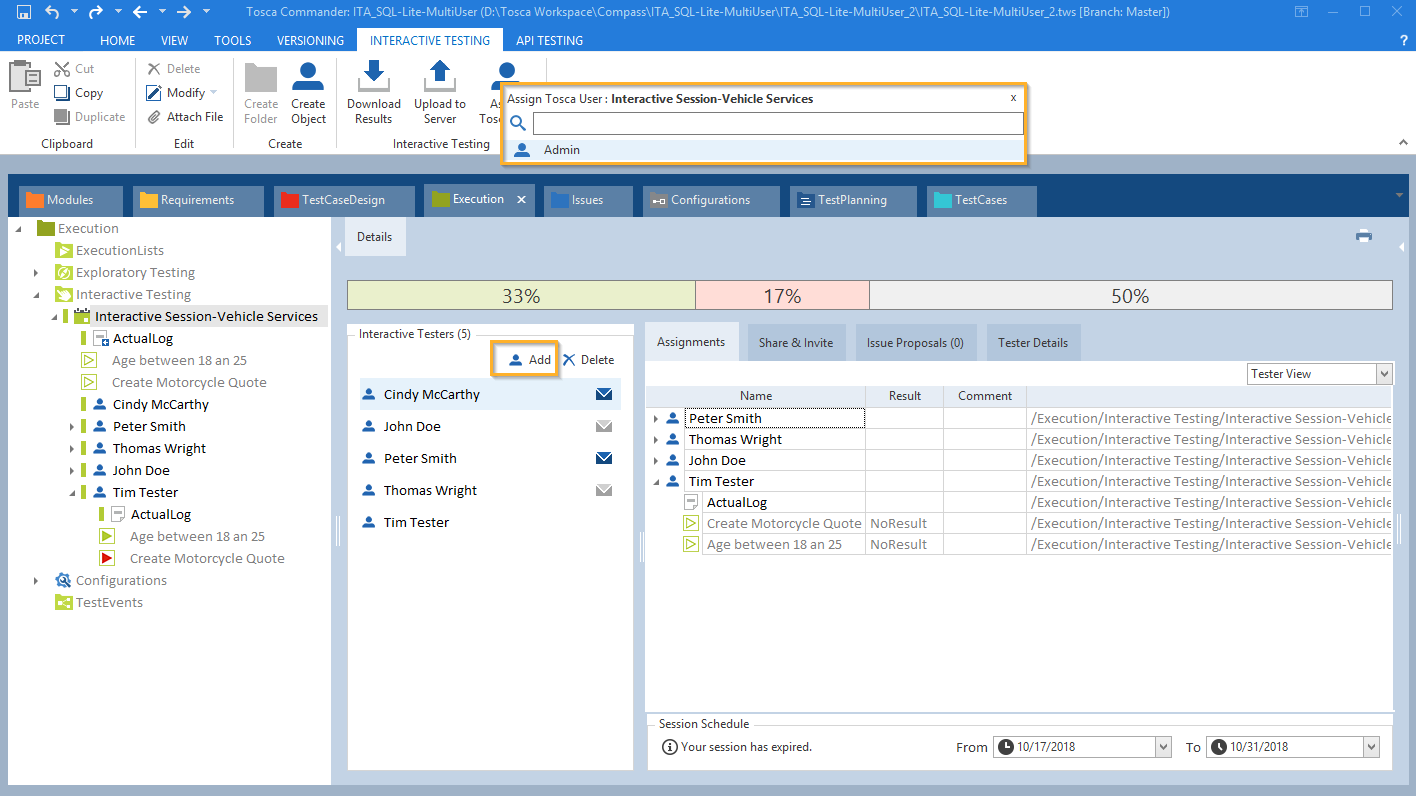 Add im Bereich Interactive Testing der Session klicken oder Strg+T drücken, um die Liste der vorhandenen Benutzer anzuzeigen.Das Fenster Assign Tosca User: Interactive Session öffnet sich.