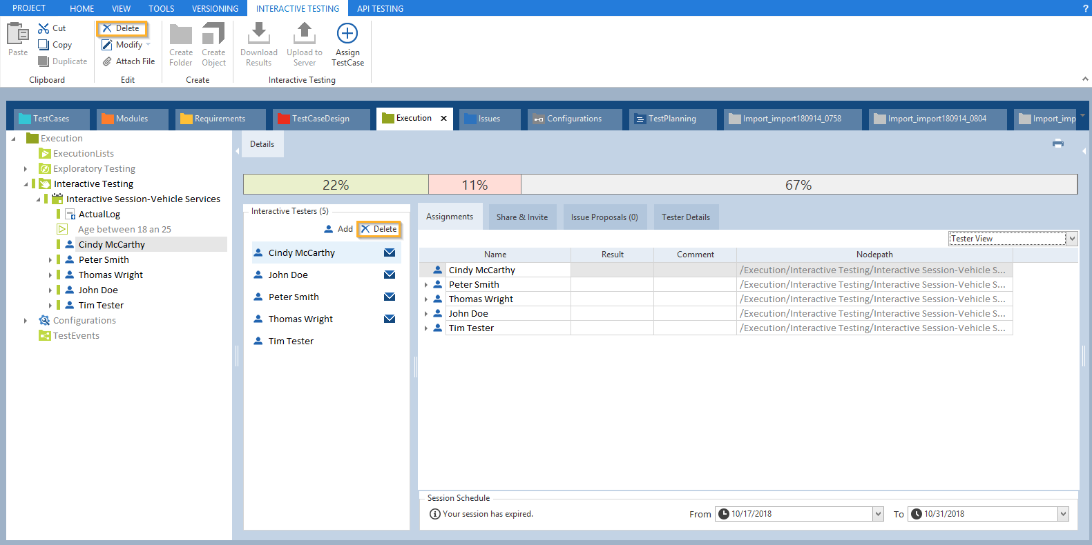 Wählen Sie den gewünschten Tester, den Sie aus der Session löschen möchten, in der Session-Baumansicht aus.