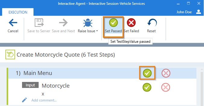 Um das Ergebnis eines Testschritts oder Testschrittwerts festzulegen, wählen Sie diesen aus und klicken Sie im Menüband des Interactive Testing Agent oder neben dem jeweiligen Testschritt oder Testschrittwert auf