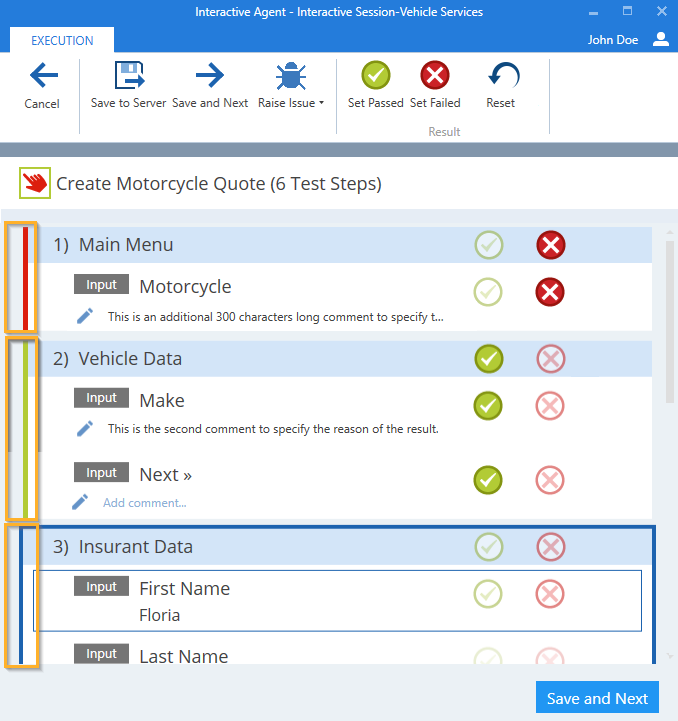 Sobald Sie ein Ergebnis für alle Testschritte festgelegt haben, klicken Sie auf Save and Next, um Ihre Ergebnisse auf dem Interactive Testing Server zu speichern und mit dem nächsten zugewiesenen Testfall fortzufahren. Wenn Sie keine weiteren zugewiesenen Testfälle haben, fahren Sie mit der Ansicht Session Briefing fort.