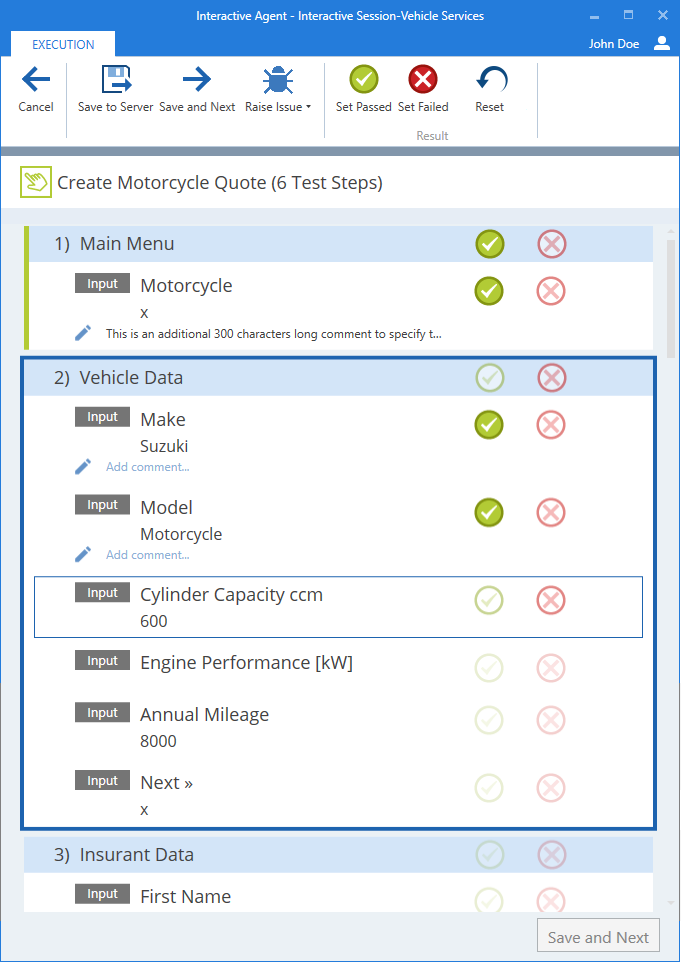 Sie können Ihre Testschritte und Testschrittwerte in der Ansicht Execution des Interactive Testing Agent verwalten. Die Ansicht Execution listet die Testschritte des Testfalls auf und zeigt die Testschrittwert Ihres Szenarios in einer erweiterten Ansicht an.