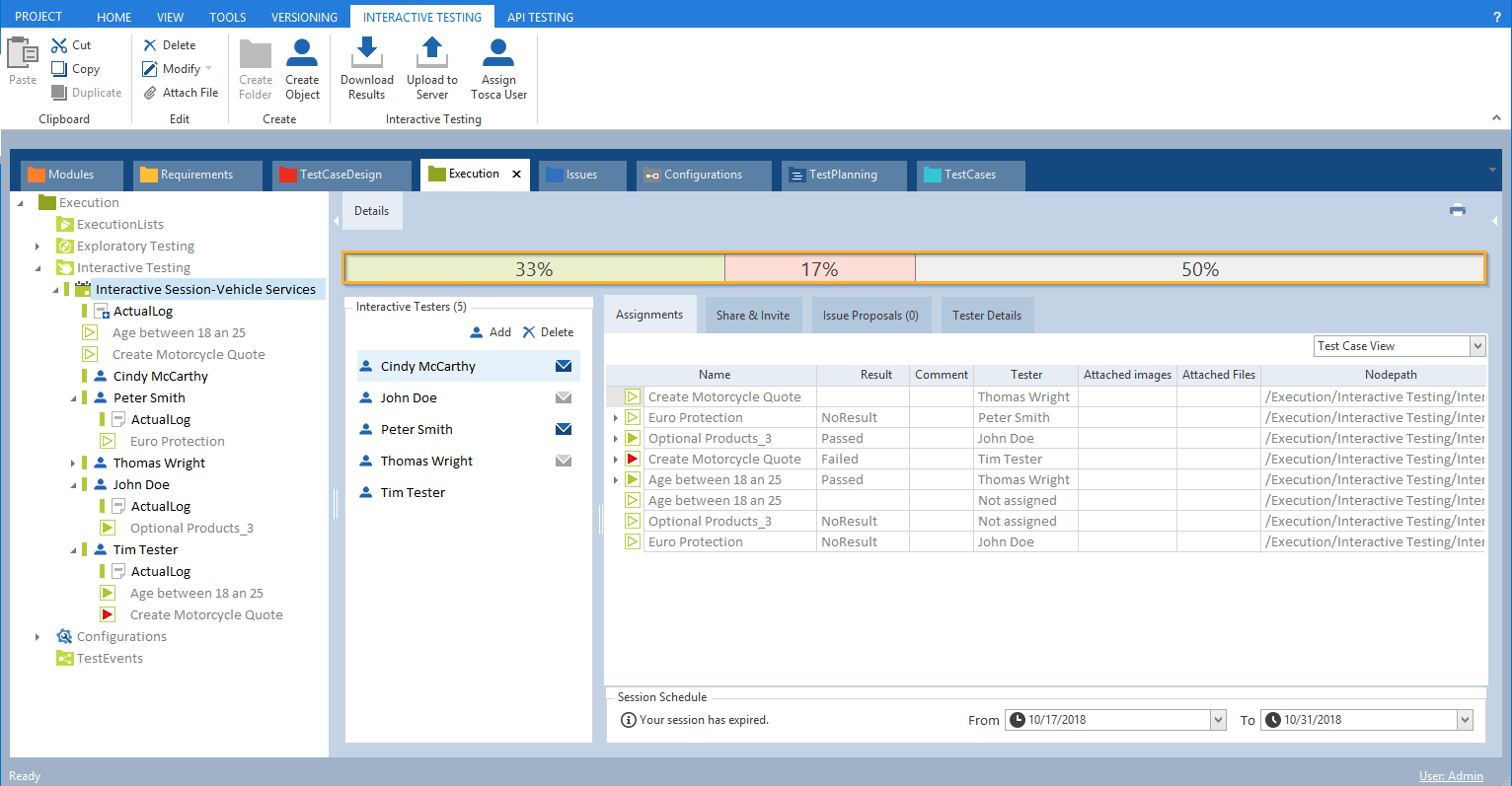 Die oberste Zeile in der Session View zeigt die Ergebnisse mit Farbcodes und Prozentsätzen der in der ausgewählten Session ausgeführten Testfälle. Auf diese Weise können Testmanager sicherstellen, dass alle Testfälle von einem Tester ausgeführt werden.