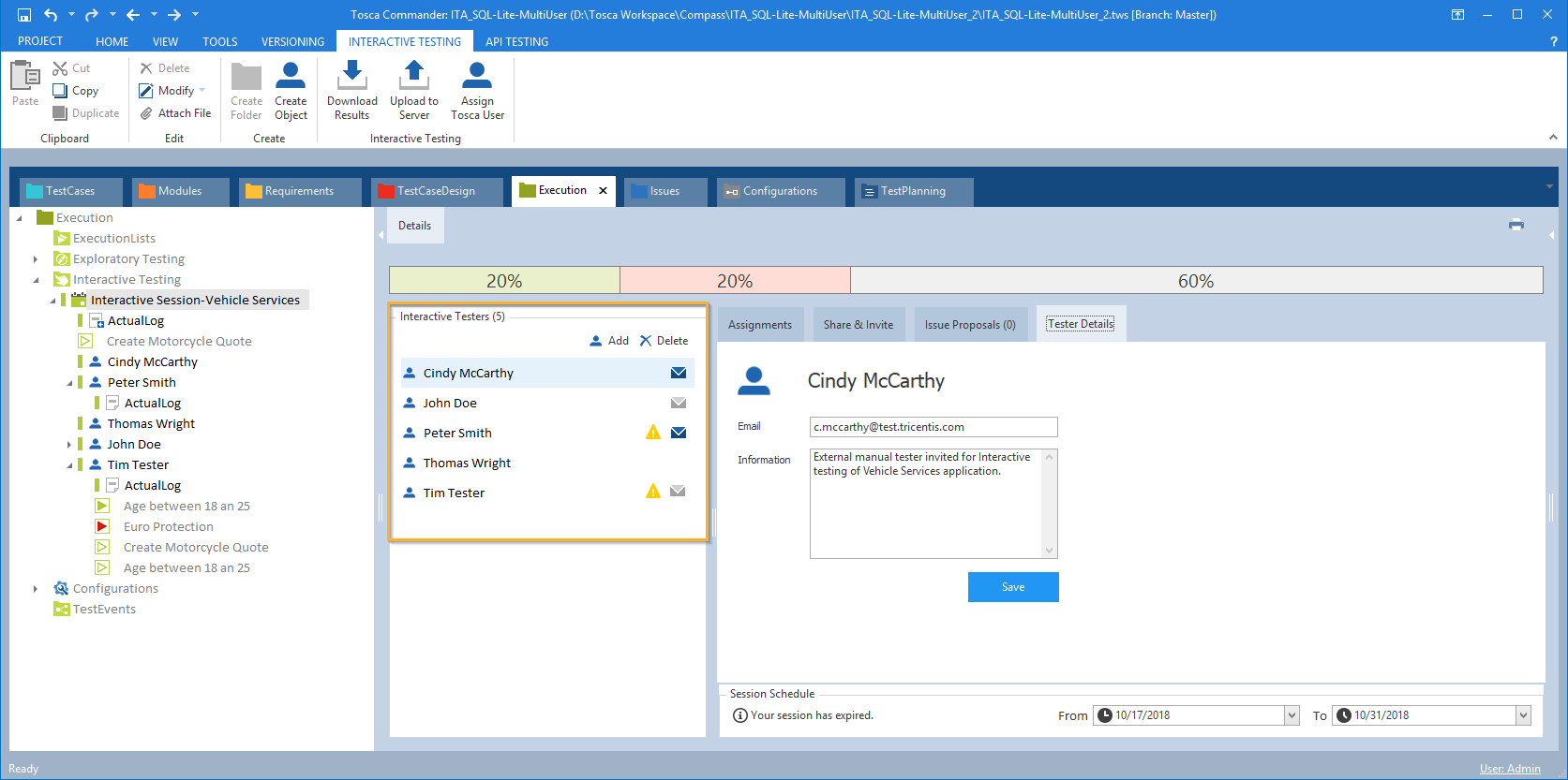 Der Bereich Interactive Testers enthält Informationen über die interaktiven Tester und die ihnen zugewiesenen Testfälle.