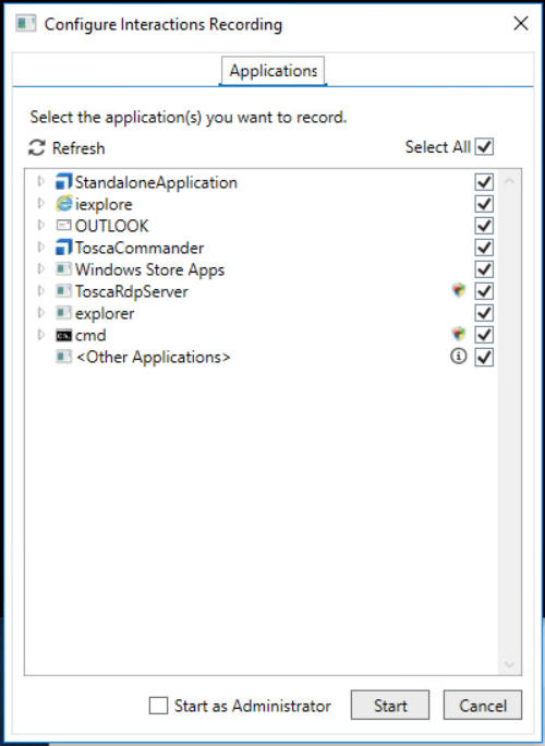 Wählen Sie im Folgedialog Configure Interactions Recording die Applikationen aus, die Sie aufzeichnen möchten. Wenn für die Applikationen Administratorrechte erforderlich sind, aktivieren Sie das Kontrollkästchen Start as Administrator.