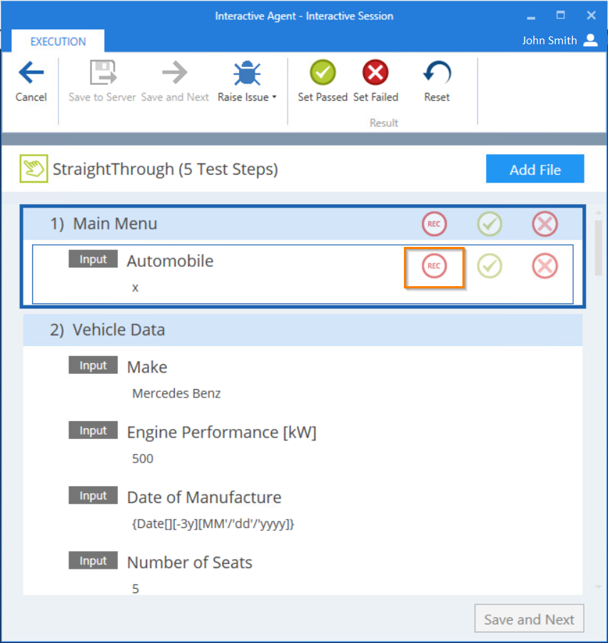 Die Aufzeichnungsfunktion ist für jeden Testschritt und Testschrittwert innerhalb des interaktiven Testfalls verfügbar.