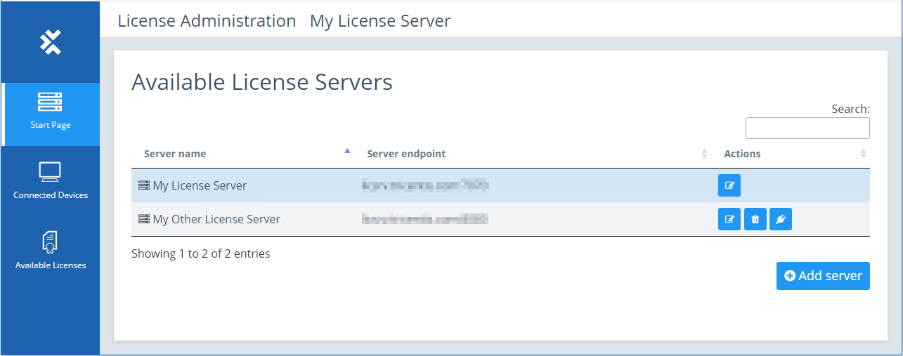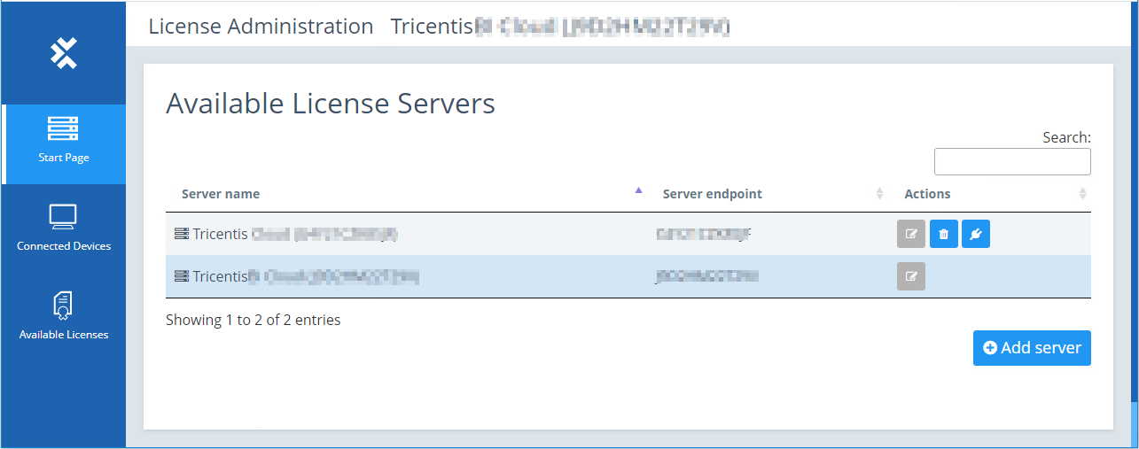 Sie können so viele Server hinzufügen, wie Sie möchten, Sie können jedoch immer nur eine Verbindung zu einem Server herstellen. Die Tosca License Administration kennzeichnet verbundene Server in blau.