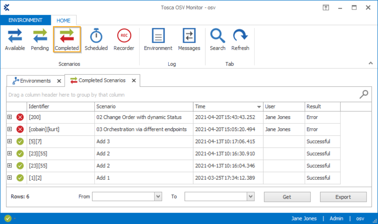 Der Reiter Completed Scenarios zeigt alle fertiggestellten Szenarien des OSV Environment, mit dem Sie verbunden sind.