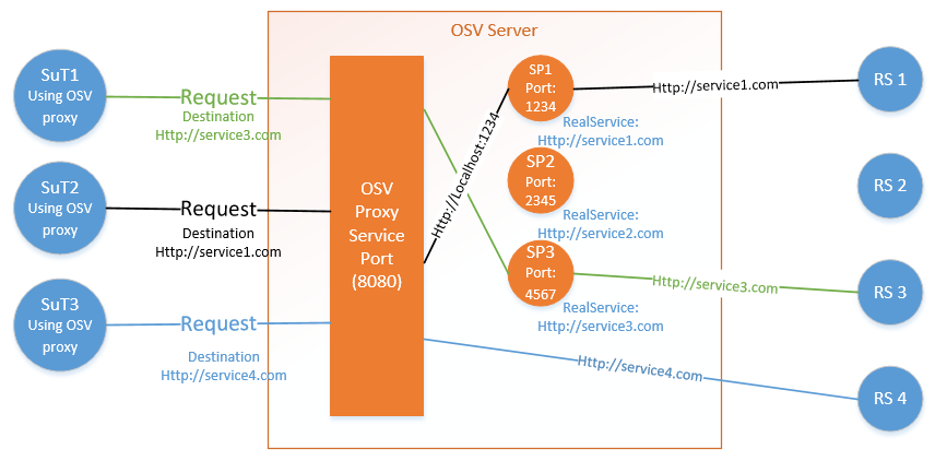 Wird eine Nachricht empfangen, überprüft der Proxy die Ziel-URL des Requests. Entspricht sie einem realen Service, leitet der Proxy die Nachricht an den entsprechenden Serviceport weiter. In allen anderen Fällen, leitet der Proxy die Nachricht ans angegebene Ziel weiter.