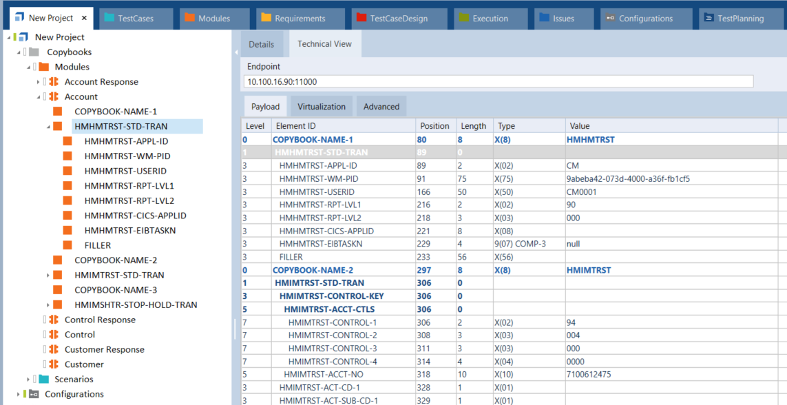 Zuerst müssen Sie Ihre Copybook-Nachrichten importieren wie im Kapitel "Copybook-Nachrichten importieren" beschrieben. Anschließend können Sie Modulattribute definieren und deren Werte überprüfen.