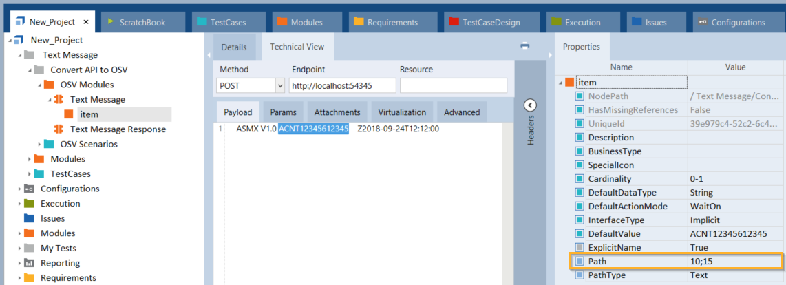 Der Parameter Path im Fensterbereich Properties enthält die Zeicheninformationen, getrennt durch einen Strichpunkt. Die erste Zahl legt die Position des ersten Zeichens des Modulattributs fest. Die zweite Zahl definiert die Gesamtanzahl der Zeichen, aus denen das Modulattribut besteht.