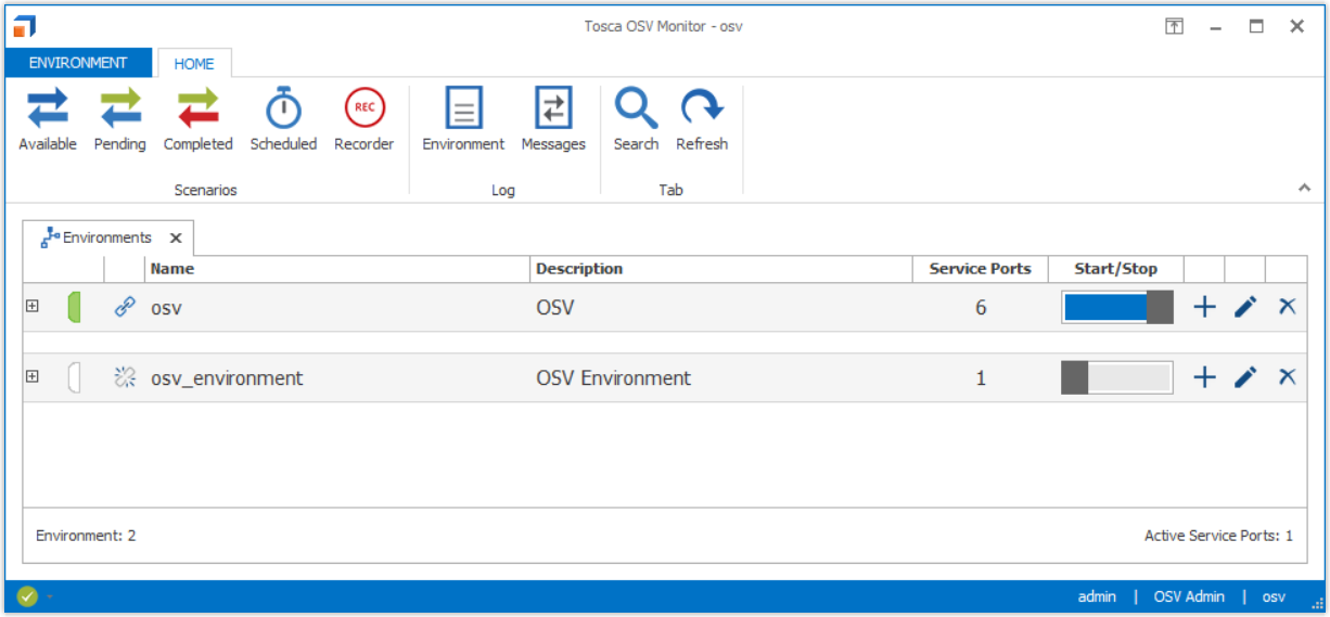 Wenn Sie ein Administrator sind, ist der Reiter standardmäßig geöffnet, wenn Sie auf den Tosca OSV Monitor zugreifen. Falls Sie ihn geschlossen haben, können Sie ihn über das Menü Environment wieder öffnen.