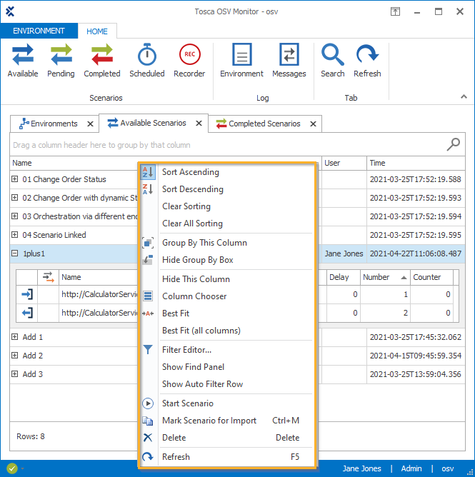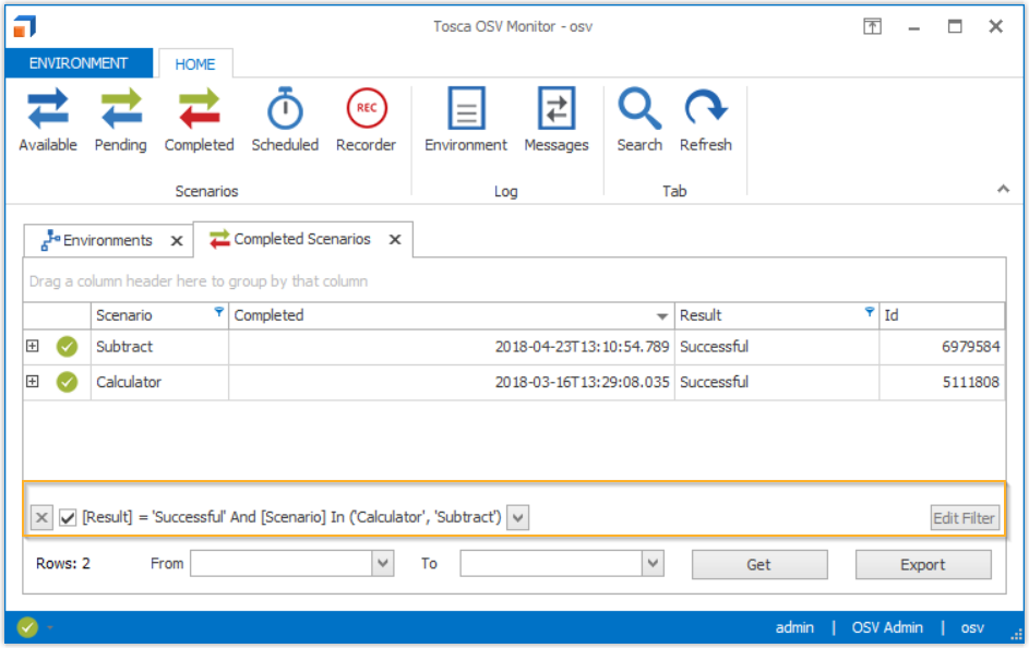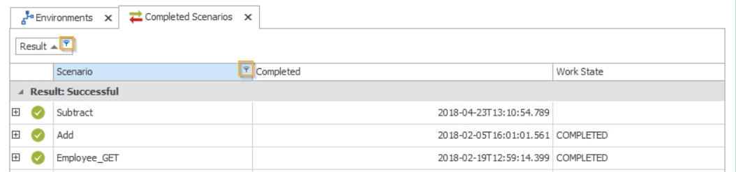 Beispielsweise können Sie die Option Group by this column verwenden, um Ihre fertiggestellten Szenarien in der Spalte Result zu gruppieren und nach dem Ergebnis Successful zu filtern. In diesem Fall zeigt der Tosca OSV Monitor nur fertiggestellte, erfolgreiche Szenarien an.