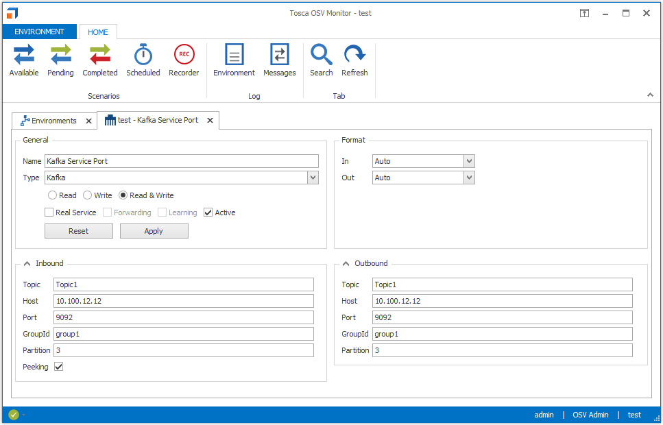 Verwenden Sie den Serviceporttyp Kafka, um eine Verbindung zu Apache-Kafka-Themen herzustellen und Nachrichten per Push zu verschieben bzw. per Pull abzurufen. Ein Kafka-Thema speichert Datensätze (Nachrichten), die von einem oder mehreren Publishern gesendet und von einem oder mehreren Consumern gelesen werden. Ein OSV-Serviceport repräsentiert einen Consumer eines Kafka-Themas. Das bedeutet, dass Sie für jeden Consumer einen Serviceport anlegen müssen.