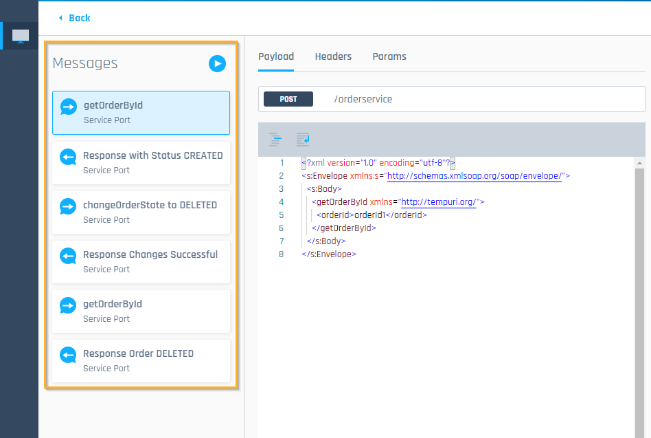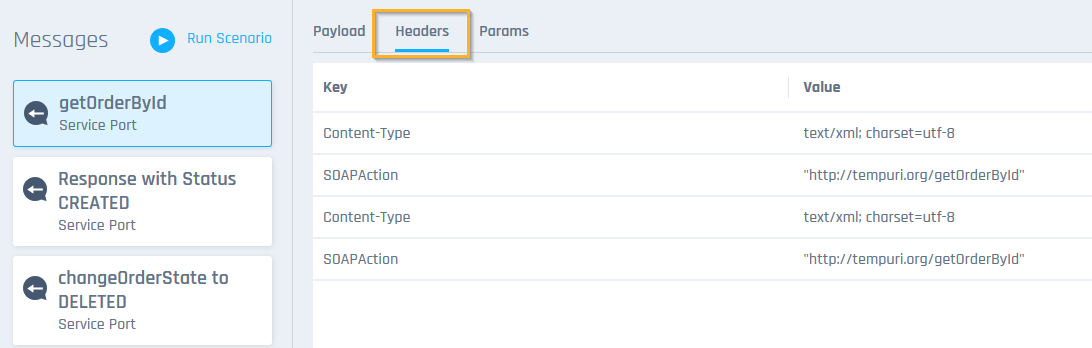 Ein OSV-Szenario definiert die Reihenfolge der ein- und ausgehenden Nachrichten zwischen dem zu testenden System (SUT) und OSV. Es definiert auch den Inhalt dieser Request- und Response-Nachrichten. Dieser Inhalt wird Payload genannt. Zusätzlich zur Payload kann eine Nachricht Header, Parameter oder Anhänge enthalten.