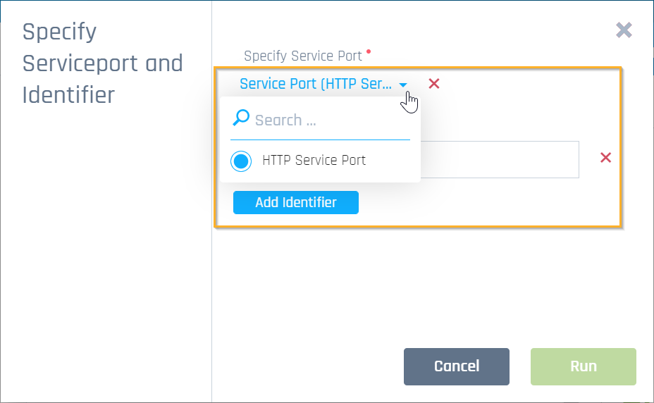 Geben Sie im folgenden Fenster den Service Port und Identifier für Ihr Szenario an. Wählen Sie dazu einen Serviceport aus dem Aufklappmenü. Geben Sie den Wert Ihres Bezeichners an. Um mehr als einen Bezeichner zu definieren, klicken Sie auf die Schaltfläche Add Identifier.