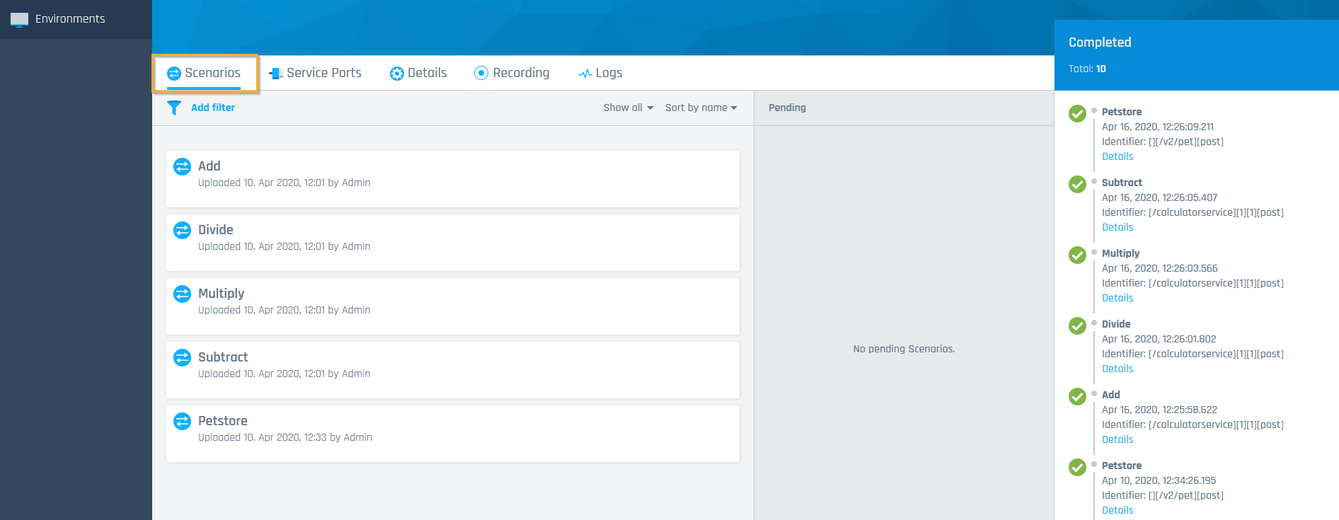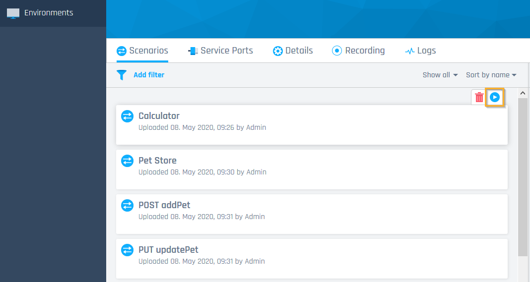 In der Regel werden Ihre Testaktivitäten blockiert, wenn Ihre Services nicht verfügbar sind. Mit OSV können Sie Szenarien verwenden, anstatt mit den realen Services kommunizieren zu müssen. Auf diese Weise können Sie die Tests fortsetzen, auch wenn ein Service nicht verfügbar ist. Jedes Szenario gehört zu einem OSV Environment, in dem Sie es ausführen können.