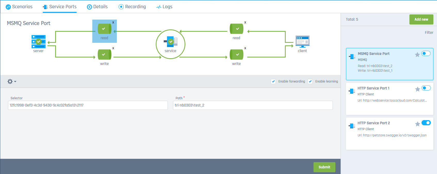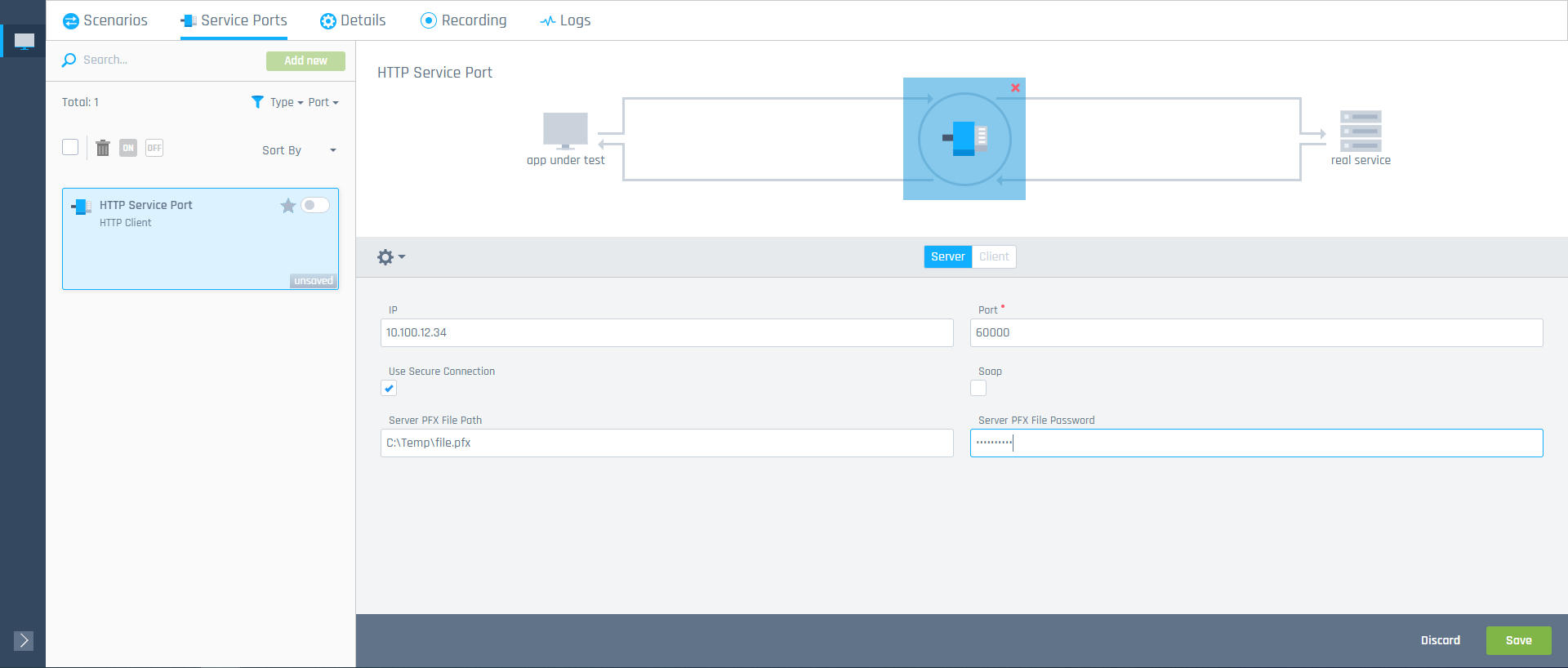 Ein OSV-Serviceport fungiert als virtueller Service-Endpunkt für jeden realen Service, den Ihre Applikation verwendet. Sie können den Serviceport mit allen Verbindungsdetails konfigurieren, die Ihr zu testendes System (SUT) benötigt, um dessen Requests an den Serviceport zu senden.