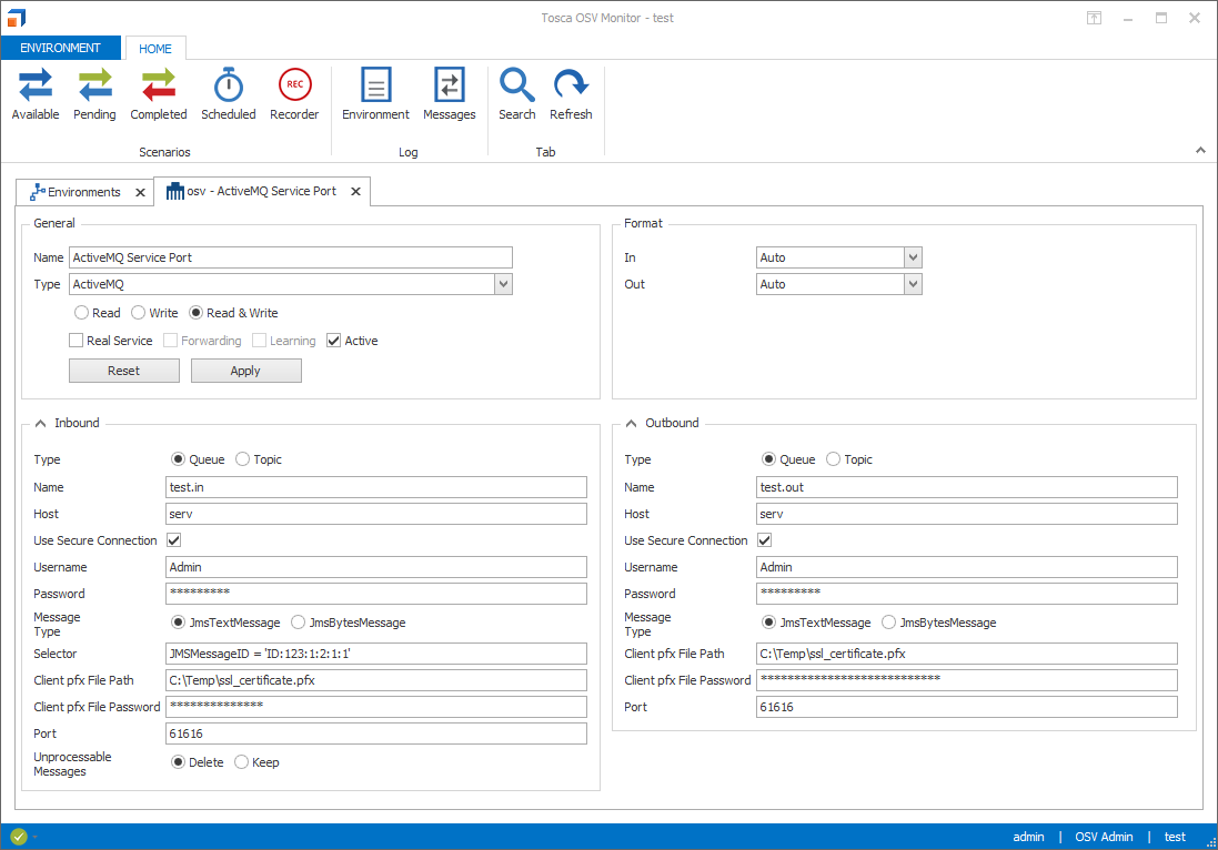 Sobald Sie Ihren Serviceport konfiguriert haben, können Sie Ihre ActiveMQ-Verbindung zum Testen verwenden. Informationen zum Bearbeiten von JMS-Nachrichten für Ihre OSV-Szenarien finden Sie hier: siehe Kapitel " JMS-Nachrichten bearbeiten".