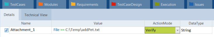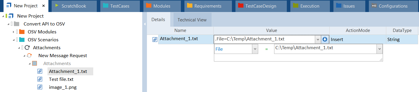 In diesem Beispiel überprüfen Sie einen Anhang in Ihrer Response-Nachricht. Das bedeutet, dass Sie mit OSV überprüfen möchten, ob der Inhalt einer Datei dem Wert des Attachment-Modulattributs entspricht. Dazu erstellen Sie ein Attachment-Modulattribut. Dann navigieren Sie zu Ihrem XTestschritt und wählen den Anhang aus. Sie fügen das Aktionsproperty File und den Dateipfad in der Spalte Value hinzu. Um zu überprüfen, ob der Inhalt der Datei dem Wert des Modulattributs entspricht, stellen Sie ActionMode auf Verify.