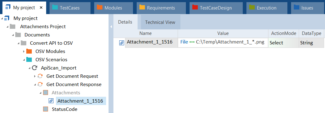 In diesem Beispiel speichern Sie einen Anhang aus einer Response-Nachricht als Datei. Der Name des Anhangs ist dynamisch, er ändert sich mit jedem Request. Zunächst erstellen Sie ein Attachment-Modulattribut. . Anschließend navigieren Sie zum XTestschritt. Sie wählen den Anhang aus und fügen die Aktionsproperty-Datei und den Dateipfad in der Spalte Value hinzu. Da Sie den genauen Namen der Datei nicht kennen, verwenden Sie einen Platzhalter (*) im Dateipfad. Um die Datei zu speichern, setzen Sie die Aktion auf Select.