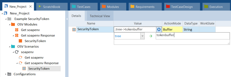Modulattribut SecurityToken hinzufügen Gehen Sie zu Ihrem XTestschritt und wählen Sie das Modulattribut aus. Geben Sie im Aufklappmenü Value den Wert tree sowie den Buffernamen ein. Wählen Sie im Aufklappmenü ActionMode den Eintrag Buffer.