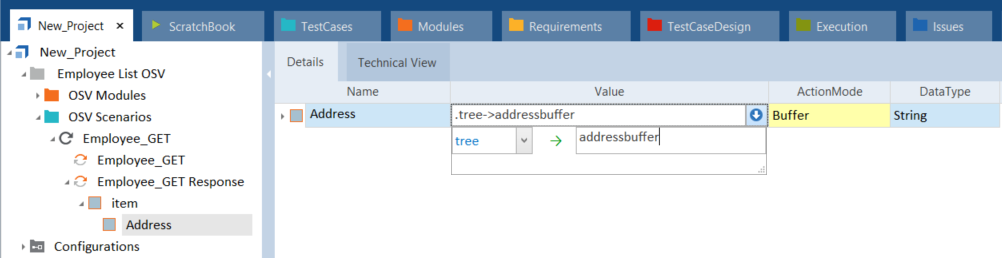 Modulattribut Address hinzufügen Gehen Sie zu Ihrem XTestschritt und wählen Sie das Modulattribut aus. Geben Sie im Aufklappmenü Value den Wert tree sowie den Buffernamen ein. Wählen Sie im Aufklappmenü ActionMode den Eintrag Buffer.