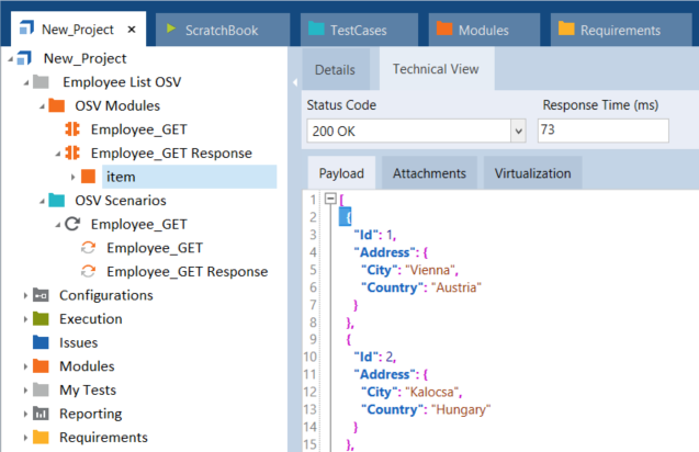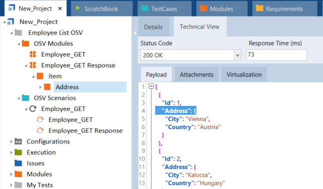 Im folgenden Beispiel erstellen Sie einen Tree-Buffer aus einer JSON-Struktur. Um den richtigen Pfad für das Tree-Modulattribut zu definieren, fügen Sie das Wurzelelement der Nachricht als Modulattribut im Tosca Commander hinzu.