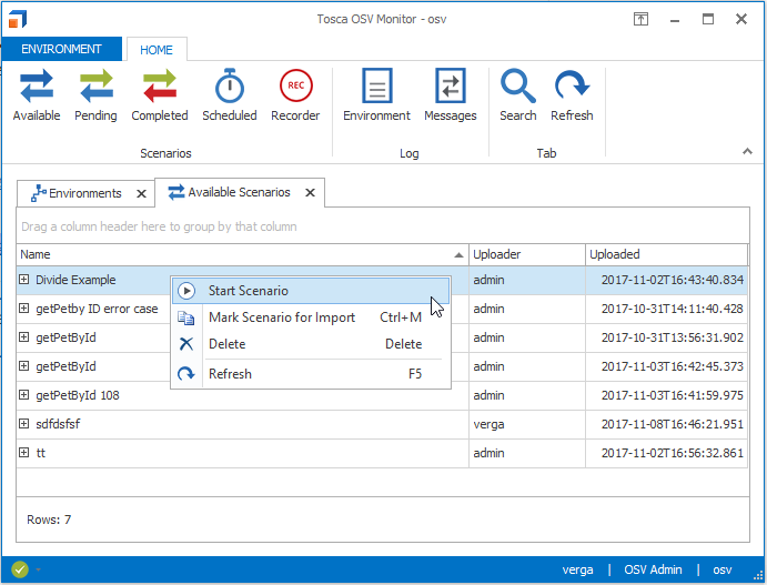 Klicken Sie mit der rechten Maustaste auf ein Szenario und wählen Sie im Kontextmenü die Option Start Scenario.