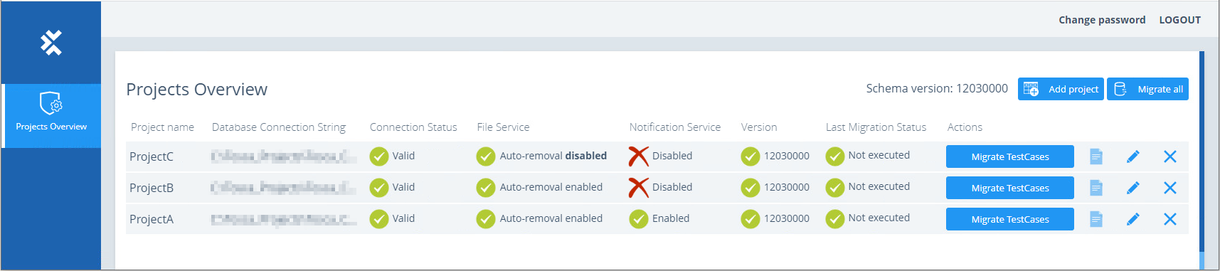 Überprüfen Sie, ob Projekte den Tricentis File Service oder den Tricentis Notification Service verwenden. Für den File Service sehen Sie auch, ob die automatische Löschung aktiviert oder deaktiviert ist. Wenn Sie diese Konfigurationen für ein Projekt ändern möchten, bearbeiten Sie sie.