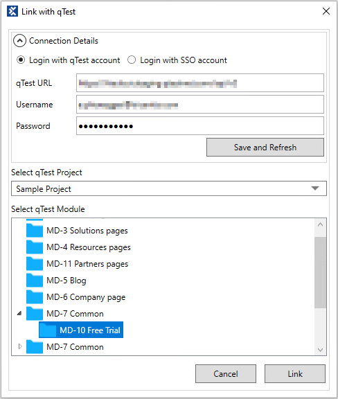 3. Im Abschnitt Connection Details des Dialogs Link with qTest, melden Sie sich bei qTest an. Sie müssen dies nur einmal machen. Tricentis Tosca merkt sich Ihre Anmeldedaten.