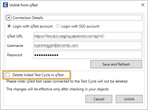 3. Wenn Sie nicht mehr angemeldet sind, geben Sie Ihre qTest-Anmeldedaten im Abschnitt Connection Details des Dialogs Unlink from qTest wie hier beschrieben ein.