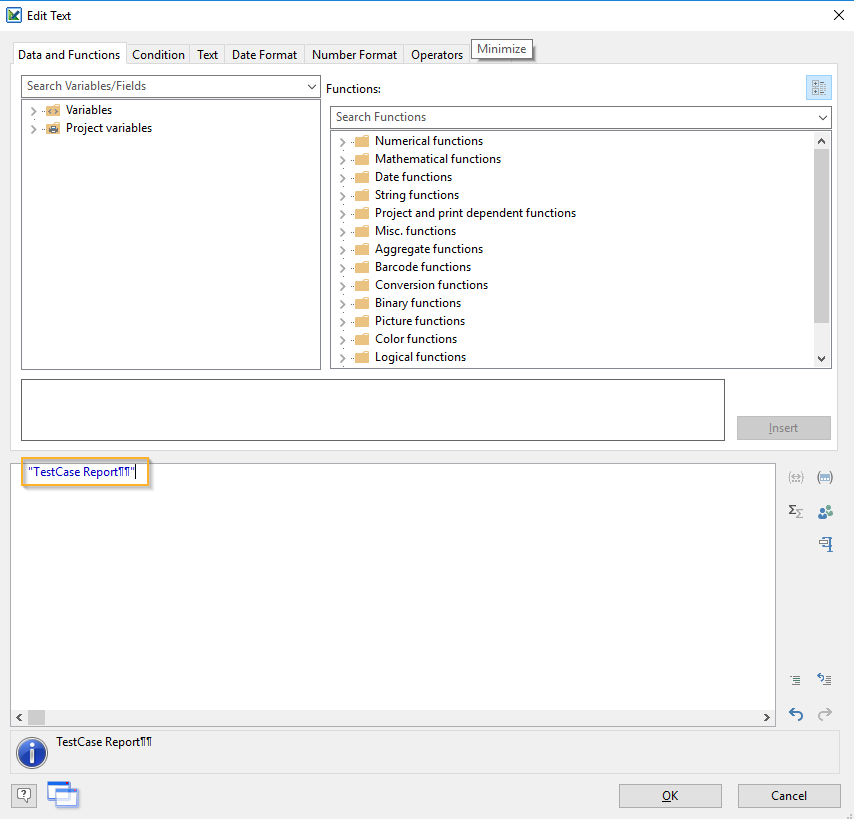 Der Reiter Data and Functions zeigt den Text als String an: "Tricentis¶¶". Sie können es zu Ihren gewünschten Text ändern.