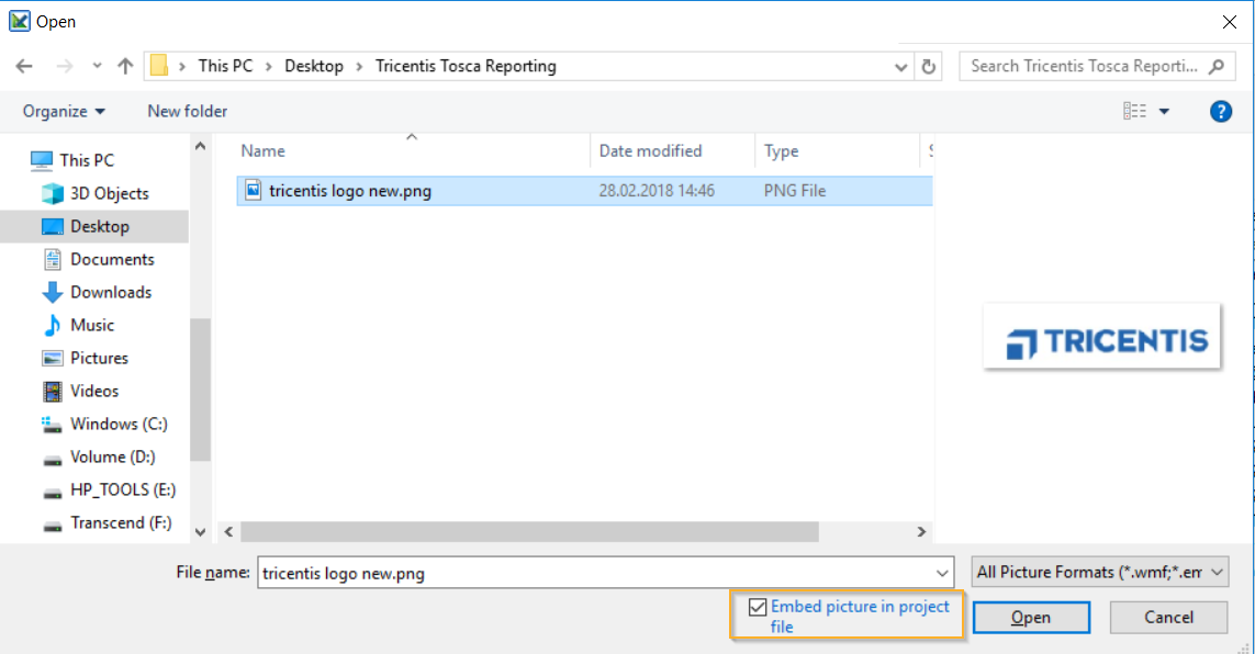 Wählen Sie im folgenden Browserfenster ein Bild, mit dem Sie das Tricentis Logo ersetzen möchten. Stellen Sie sicher, dass das Kontrollkästchen Embed picture in project file aktiviert ist.