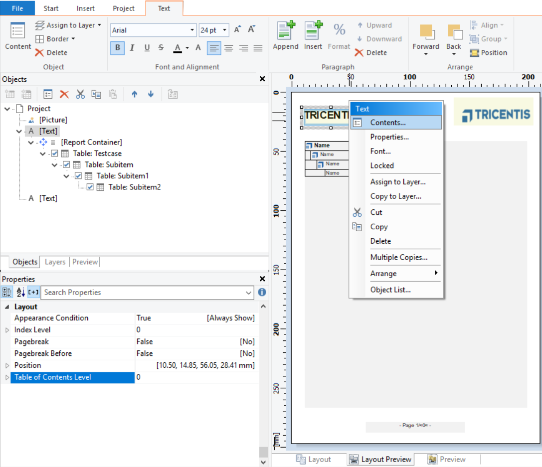 Klicken Sie mit der rechten Maustaste in das Textfeld und wählen Sie Contents aus dem Kontextmenü. Das Fenster Absatz-Eigenschaften öffnet sich.
