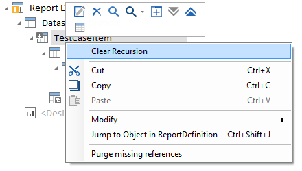 Sie können eine Rekursion entfernen, indem Sie mit der rechten Maustaste auf eine rekursive Dataset Definition klicken und Clear Recursion aus dem Kontextmenü wählen