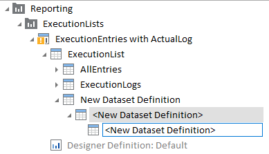 Jede Dataset Definition innerhalt einer Report Definition muss einen eindeutigen Namen haben. Ist dies nicht der Fall, ist das Symbol Report Definition mit einem gelben Ausrufezeichen gekennzeichnet: |