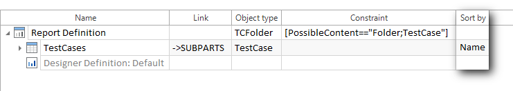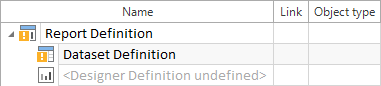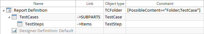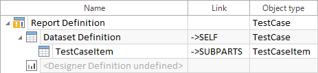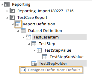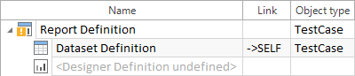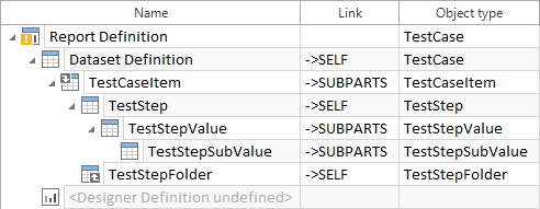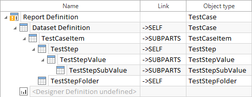 Im Beispiel oben wird die rekursive Struktur des Testfallelements Dataset Definition für weitere Testschrittordner wiederholt, wodurch eine Art Schleife entsteht. Die oben definierte Rekursion beginnt mit einem TestCaseItem, aus dem Sie jegliche Testschritte filtern können. Diese können Testschrittwerte enthalten, die weiter Testschritt-Teilwerte enthalten können. Der nächste Testschrittordner enthält wiederum Testschrittelemente, aus denen Sie beliebige Testschritte sowie verschachtelte Testschrittwerte und Testschritt-Teilwerte auswählen möchten. Die rekursive Struktur Ihrer Dataset Definition ermöglicht es alle Testschrittordner, Testschritte, Testschrittwerte und Testschritt-Teilwerte in Ihren Report zu inkludieren. Um den Report zu drucken, müssen Sie zuerst die Designer Definition erstellen. Solange die Designer Definition undefiniert ist, zeigt das Symbol Report Definition ein gelbes Rufzeichen an.