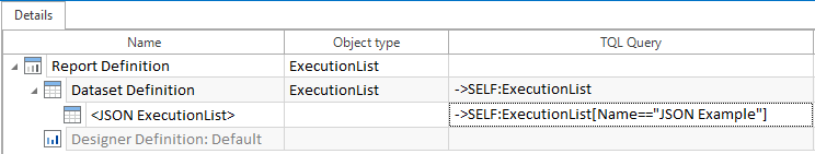 Wenn Sie einen Report erstellen, bezieht sich die TQL-Zeichenfolge jeder Dataset Definition auf ihr Wurzelelement. Eine TQL-Suchanfrage, die bei der obersten Dataset Definition durchgeführt wird, wird auf jedes Objekt, für das ein Report erstellt wird, angewendet.