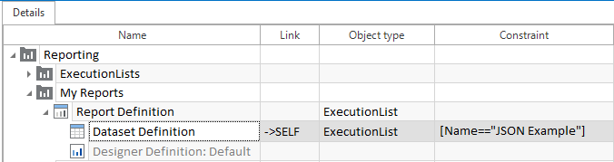 Dataset Definition. Die Dataset Definition zeigt Informationen über das Objekt, das mit der jeweiligen Report Definition verknüpft ist, von dem der Inhalt des Reports übernommen wird.