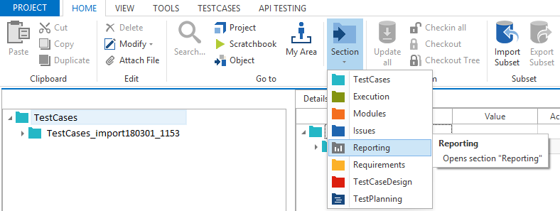 Um den Bereich Reporting zu öffnen, klicken Sie auf das Symbol Section im dynamischen Menü Home und wählen Sie Reporting aus dem Aufklappmenü.