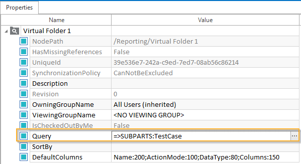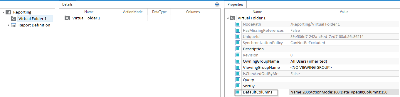 Wenn Sie einen Report aus einem virtuellen Ordner erstellen möchten, müssen Sie sicherstellen, dass die Eigenschaften Query und DefaultColumns des virtuellen Ordners Werte enthalten.